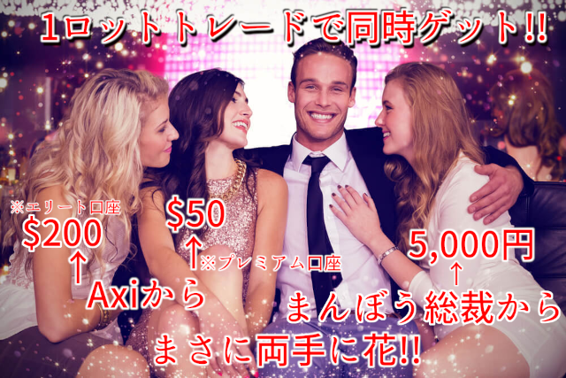 つまり、まんぼう総裁のIBリンクから口座を開設して1ロットをトレードすれば、それだけで5,000円がゲットできて、かつ、プレミアム口座であれば、さらにAxi(アクシ)から$50受け取ることが可能なのです。(エリート口座なら$200です!!)
