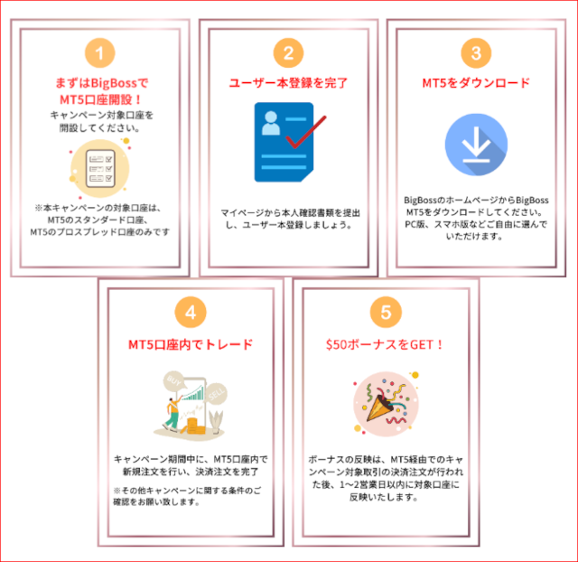 BigBoss MT5リリースを記念して、キャンペーン期間中、既存ユーザー様を含めMT5口座ではじめてお取引をしていただいた方全員に、$50分のクレジットボーナスをプレゼントいたします!