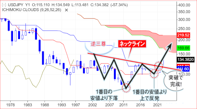 急ごしらえのチャートですが、いわゆる年足レベルで大きな逆三尊では?
