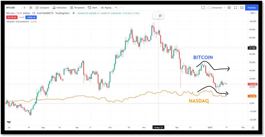 過去ですと関連性はあまりございませんが、私がみるところ、ここ最近ですとナスダックとビットコインがチャート上で非常に似た動きをしているところが興味深い点でございます。