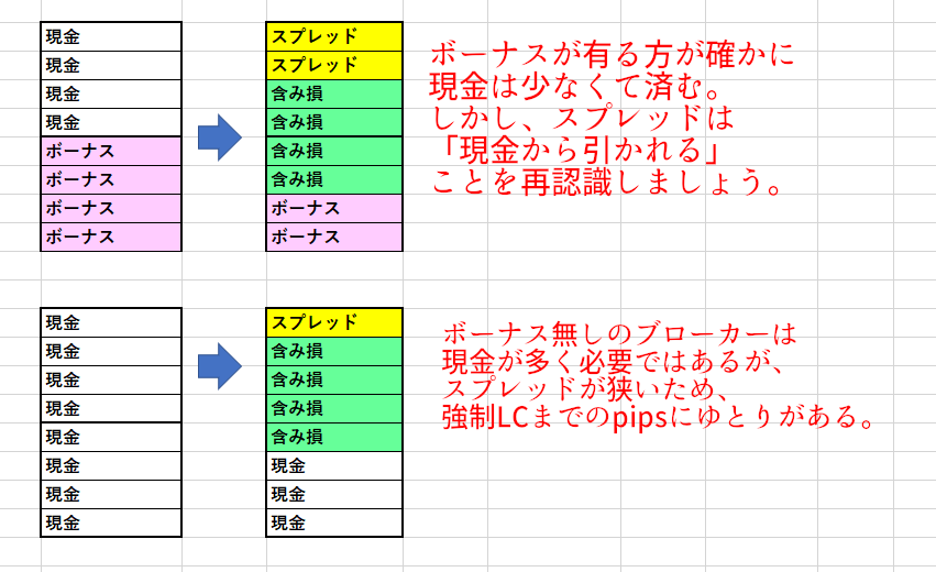 この図のように、スプレッドは先に現金から引かれるということを再認識しましょう。